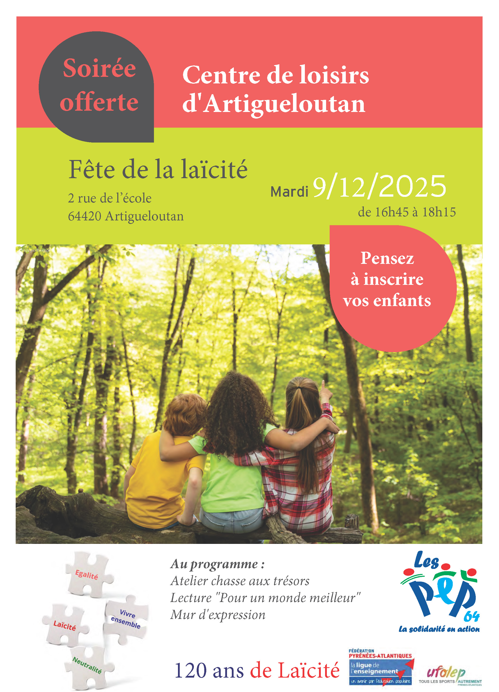 À l’occasion du 9 décembre, journée nationale de la Laïcité, et dans le cadre des 120 ans de la loi du 9 décembre 1905, le centre de loisirs d’Artigueloutan organise un événement gratuit et ouvert à tous, destiné à promouvoir la laïcité, la diversité et le vivre ensemble.